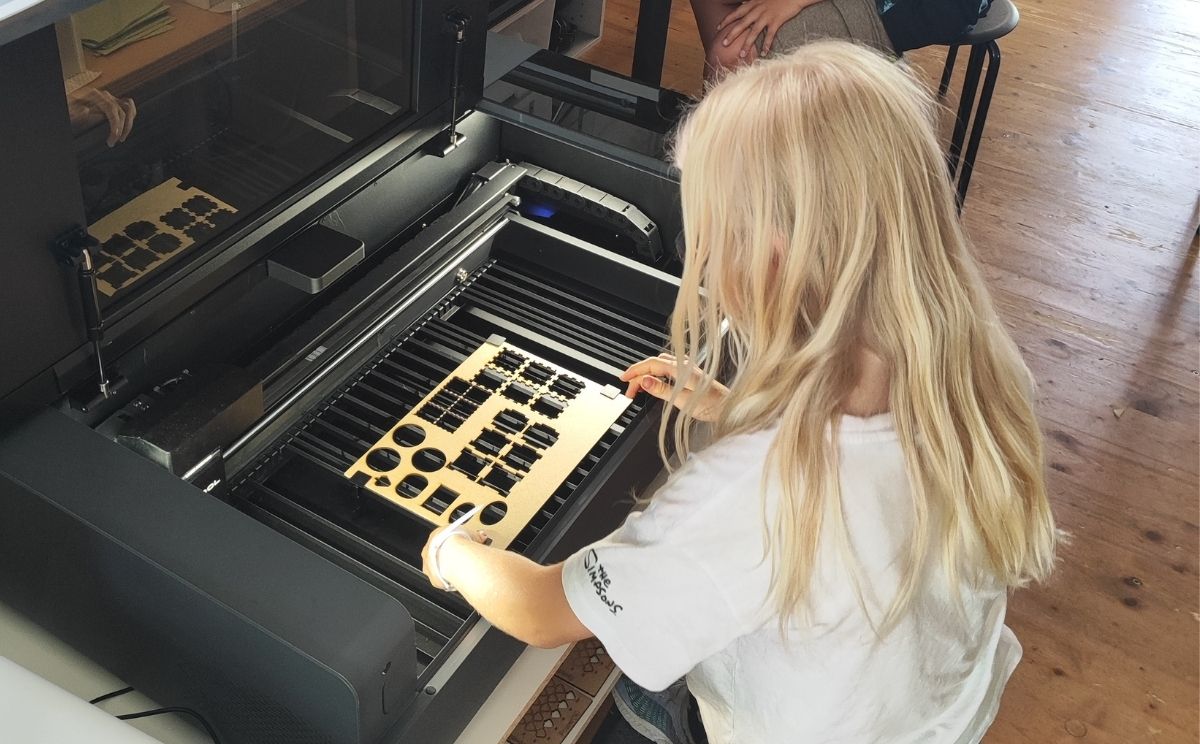 Der Morgen steht ganz im Zeichen von Technologie. Die jungen Entwicklerinnen erlernen den Umgang mit dem Lasercutter und fertigen aus ihren Ideen besondere Eigenkreationen. Nach ersten Aha-Momenten und Erfolgserlebnissen essen wir zusammen zu Mittag.